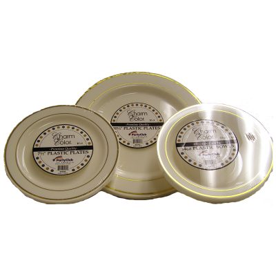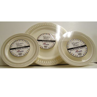 Round White Plastic Plates Bowls Silver Swirl Trim