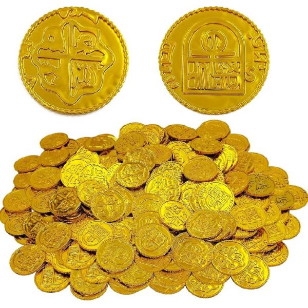 1 3/8″ Gold Plated Plastic Pirate Doubloon Coins are perfect to toss around on your pirate party table or add booty to your pirate treasure chest. Use these for Halloween, themed parties, cosplay, plays and productions. These might also look good on a costume. There are 100 pieces per package. The coloring is black and gold giving them an antique, old-looking appeal.