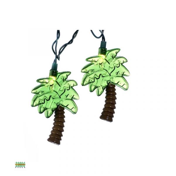 10 Electric Palme Tree Party Light Set hangs on a 30″ green wire. It includes 4 spare bulbs and 1 spare fuse. Use indoors or outdoors.