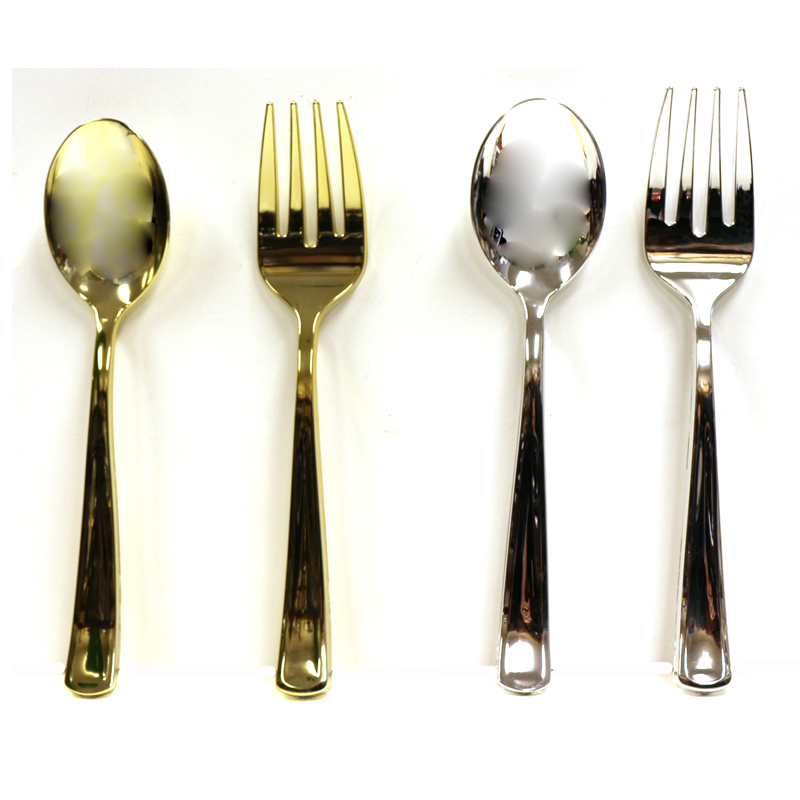 Choose a shiny gold or silver 10-inch Plated Plastic Deluxe Serving Spoon n Fork Set. Serve your guests with easy elegance. Perfect for catering or serving a New Year’s Eve party, wedding reception, Thanksgiving dinner, or any large meal!