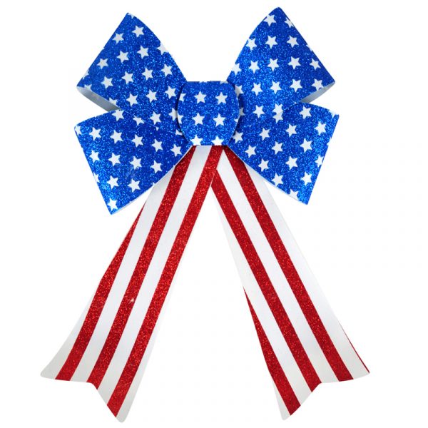 Hang a red, white, blue 10″ x 15″ Patriotic Glitter Bow in every window to show your USA spirit! White stars appear on a blue glittered background. Red glitter & white stripes form the tails of this beautiful bow. When these decorations come down, this plastic bow is recyclable!