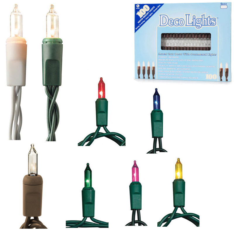100 Light Sets remain lit if one burns out, has a safety fuse plug, plugs at both ends for easy continuous lighting, steady burning or flashing, pretested to light, extra bulbs included, total length 32′.