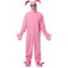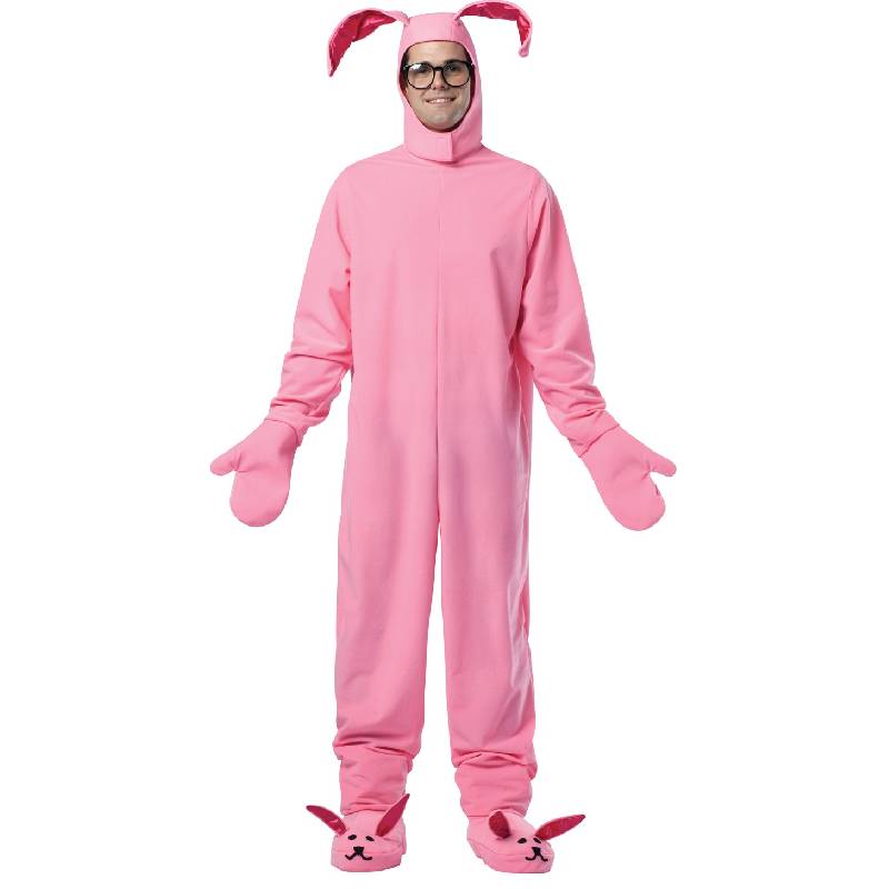Give everyone a laugh in this adult version of Ralphie’s bunny suit inspired by the classic Christmas Story movie. Costume includes a soft polyester pink bodysuit, hand mittens, headpiece with floppy bunny ears, and bunny feet shoe covers. Glasses also included. Wear this for Halloween, themed parties throughout the year, and theatrical performances.