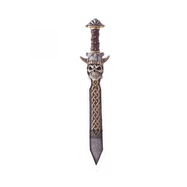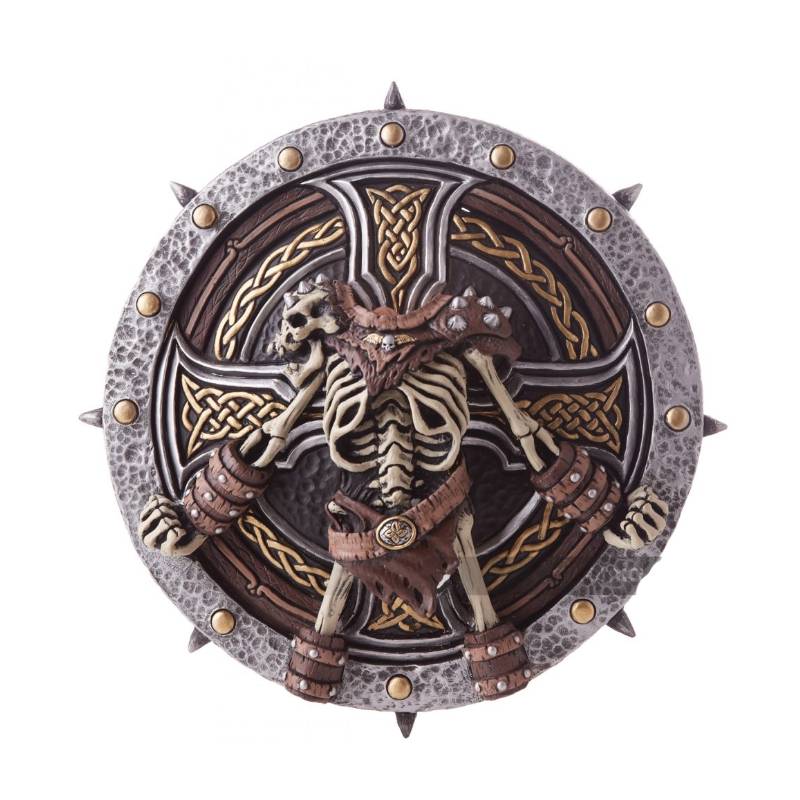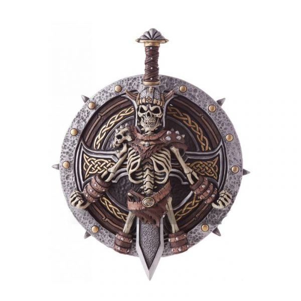 Slay you adversaries with Viking Lord Shield & Sword Set. This combo contains a sword that packs neatly into a shield. The sword showcases a skull at the base. The shield has a human skeleton with warrior garb around his shoulders and waist. His arms and feet are bound to the shield. Once the sword is sheathed into the shield the skull attaches to the rest of the skeleton. The shield is 18 ” in diameter.