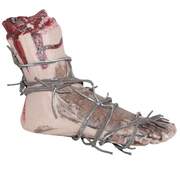 Use this 11-inch Plastic Bloody Foot wrapped in Barbed Wire for the perfect Halloween prop. Great in a Haunted House or graveyard scene.