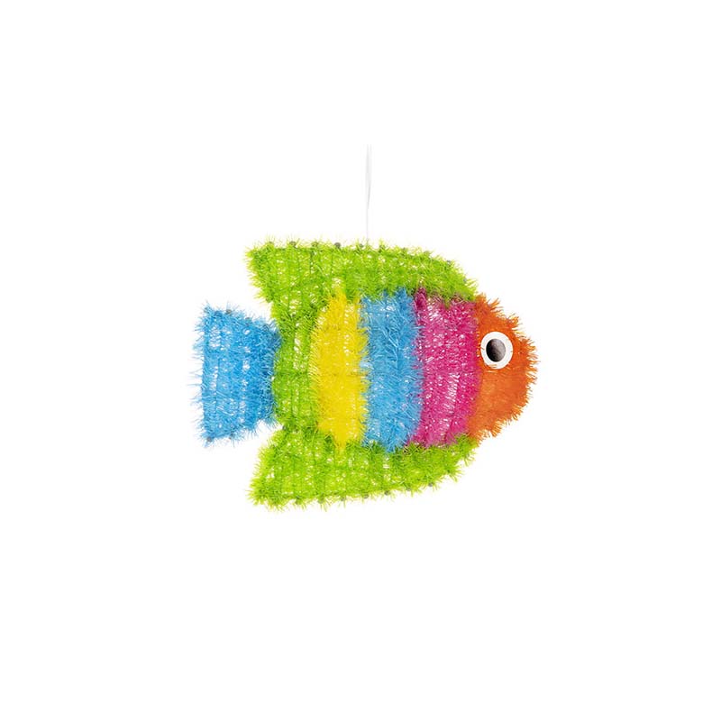 Add a shock of color to an aquatic-themed room with this bright, multi-color tinsel fish decoration. This 12.5 x 9 x 1.75-inch wall hanging swims easily into view and grabs attention with a vibrant palette, and an attached white ribbon makes hanging quick and easy.