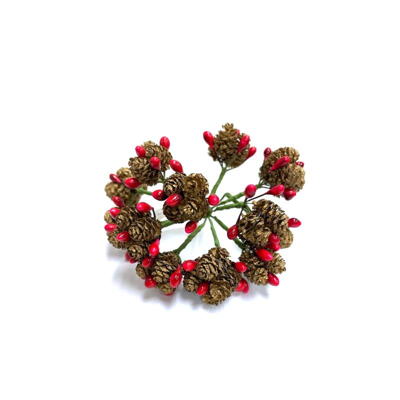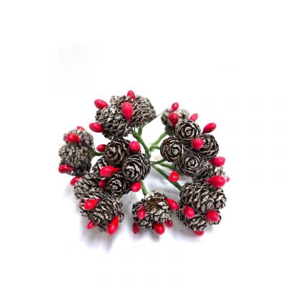 12″ Miniature Cone & Red Berry Cluster are held together with green floral wire. Buy this to complete a wreath. Use this for Christmas decorations, winter themed parties, and other types of parties. Each mini cone is surrounded by bright red berries. Use this cluster as a finishing touch to your crafty design.