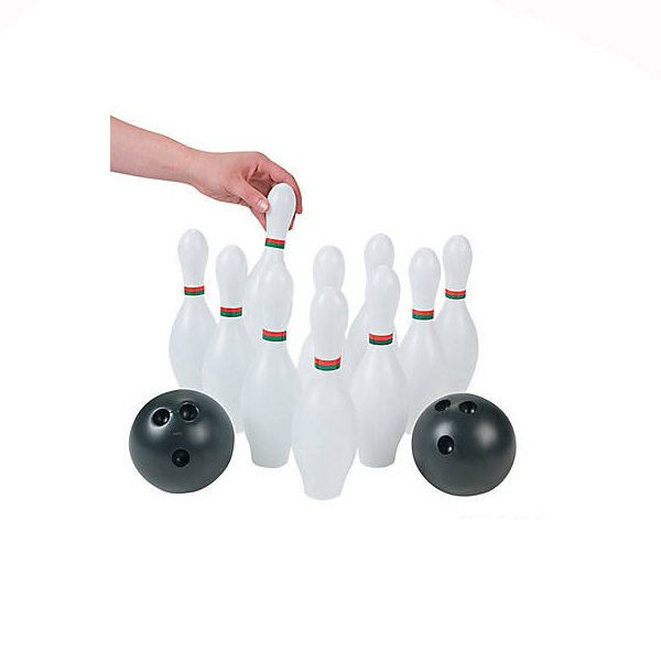 Play all day with this 12 Piece Plastic Bowling Pins n Balls Set. Set includes 12 white plastic 8″ tall bowling pins and two black plastic balls.