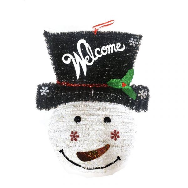 18″ Welcome Tinsel Snowman Head has snowflakes for rosy cheeks. This adorable decoration can be easily hung on doors or walls. Use this for celebrations at home or an event center.