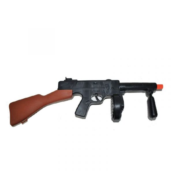 A plastic gangster machine gun is a toy replica of a classic Tommy gun, also known as a Thompson submachine gun, often associated with gangsters from the Prohibition era in the United States. The machine gun is typically made of lightweight plastic, making it safe and easy for children to handle during imaginative play. The toy gun is designed to resemble a real Tommy gun, with its distinctive shape and features. It has a long barrel, a box-shaped magazine, and a stock at the rear for stability when aiming. Despite being made of plastic, the toy gun often includes realistic details to enhance its authenticity. This may include molded-in details such as faux screws, rivets, and grooves to mimic the appearance of metal components. The plastic gangster machine gun is often painted or molded in black to mimic the appearance of a real firearm. Some versions may feature additional details such as silver accents to simulate metal parts or wood-grain patterns on the stock for added realism.