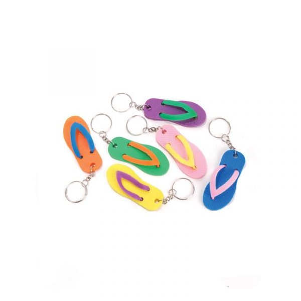 2.5 inch Rubber Flip Flop Keychain. These keychains are available in assorted colors. They are light weight and can be used for many different things. Cute and easy cupcake toppers just buy some cupcakes and lay these right ontop of the icing for a creative topper that people can keep with them on their keys! Also use these at party bag favors for a beach or luau themed party!