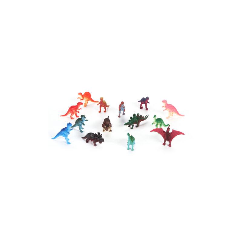 These plastic dinosaurs are great for playtime, or add to terrariums, shadow boxes, and more. Each package contains colorful animals measuring 2 inches each. Not recommended for children under the age of 6 years. 14 pieces per package.