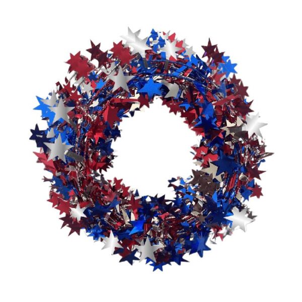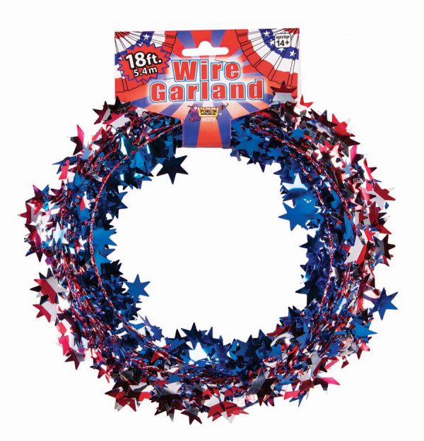 This patriotic red, white and blue star garland measures 25 feet long. The white/silver stars have red stripes on them. It features vinyl over wire (so you can bend it and shape it as you like). It can be used to decorate almost anything. Perfect for the Fourth of July!