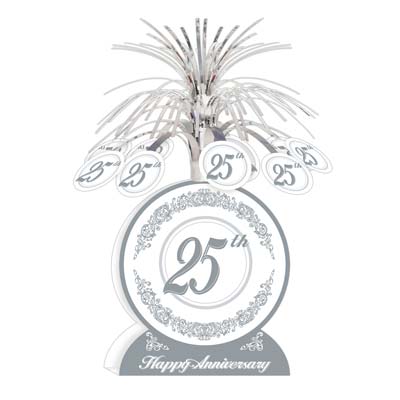 This is a beautiful centerpiece. “Happy Anniversary” is written at the base. The center is round with “25th” written in the middle and is surrounded with silver detailing. There are silver metallic sprays that shoot up from the middle with “25” on the end of the sprays.