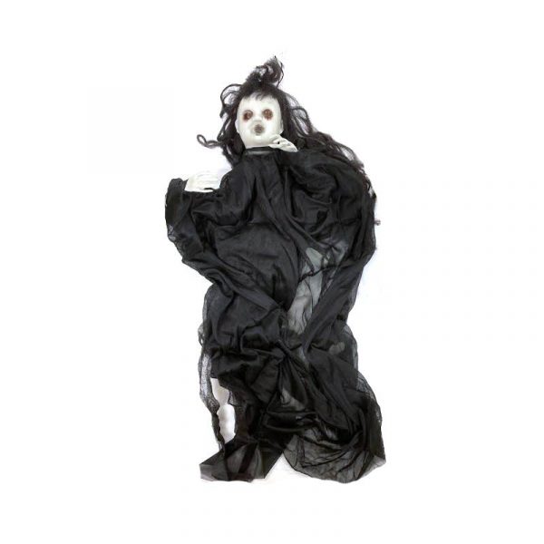 28″ Fabric Hanging Creepy Doll is a creeptacular gory decoration. This doll has ghostly pale skin and blood dripping from her eyes. Her scraggly black hair is long in the back and bangs in the front. Her slender hands reach out to grab your soul. Use this at Halloween time or for parties throughout the year.