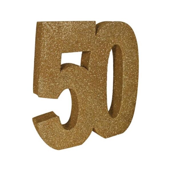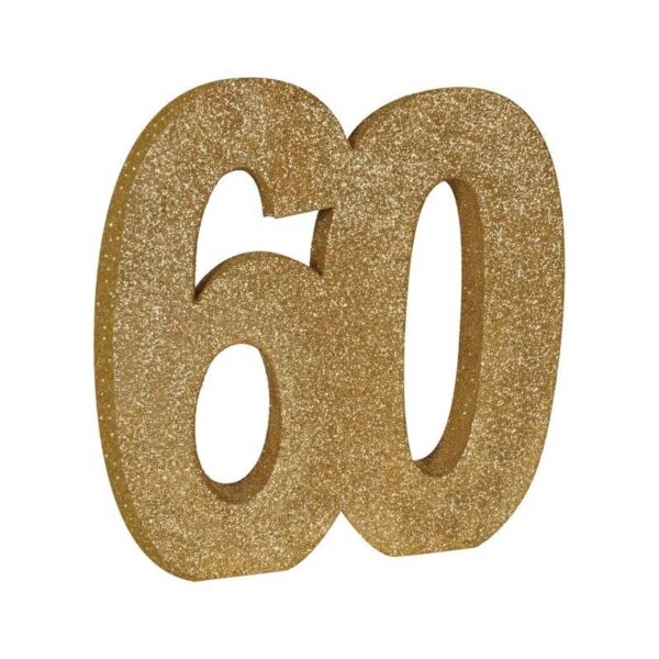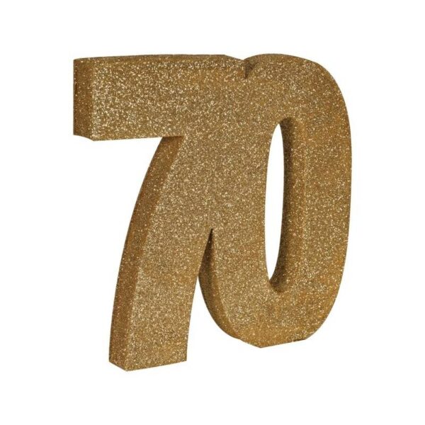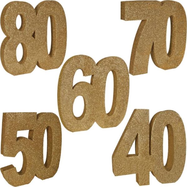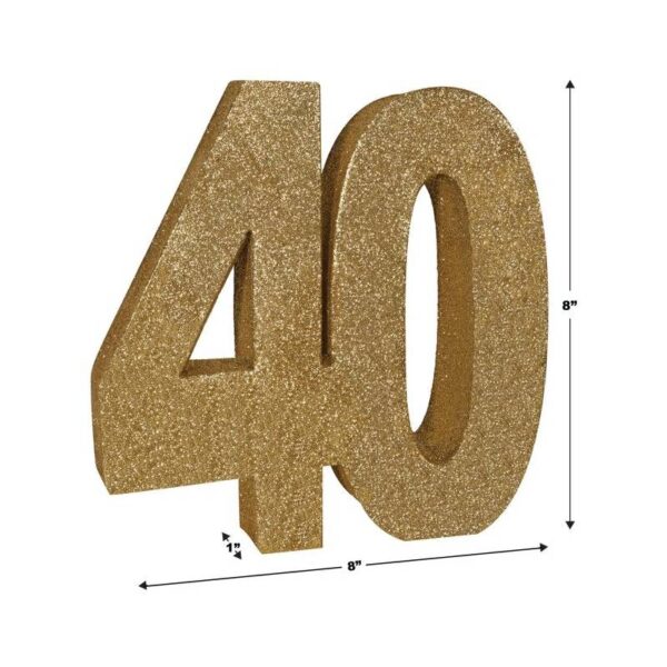 The surface of the 3-D Glittered Numeral Centerpiece is coated with gold glitter, giving it a sparkling and eye-catching appearance. The glitter adds a festive touch and enhances the visual appeal of the centerpiece, especially when it catches the light. While commonly used as table centerpieces, 3-D glittered number centerpieces can also be incorporated into other decorations such as balloon bouquets, photo backdrops, or wall displays. They can add a celebratory atmosphere to various types of events and venues. Depending on the occasion, the number can be personalized with additional embellishments such as curling ribbons of different colors, bows, flowers, or themed accents. This allows for customization to suit the specific event and individual preferences, making each centerpiece unique and memorable.