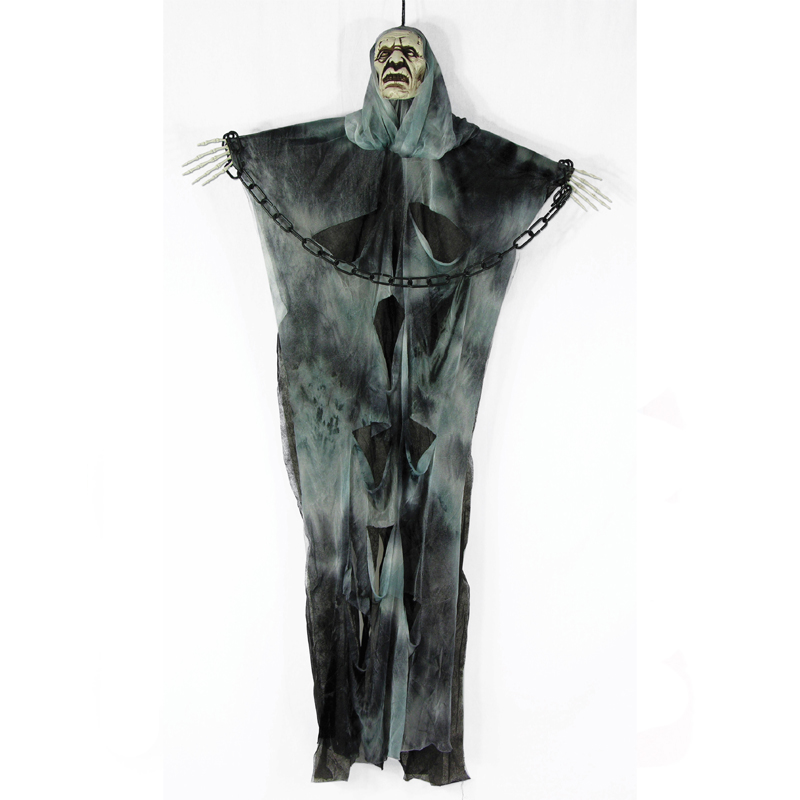 3 Foot Hanging Old Man Scary Prop. Plastic skull. loop on top for hanging. Bendable arms with skeleton hands. black/gray material hangs to blow in the wind. Plastic chain links from one wrist across to the other.