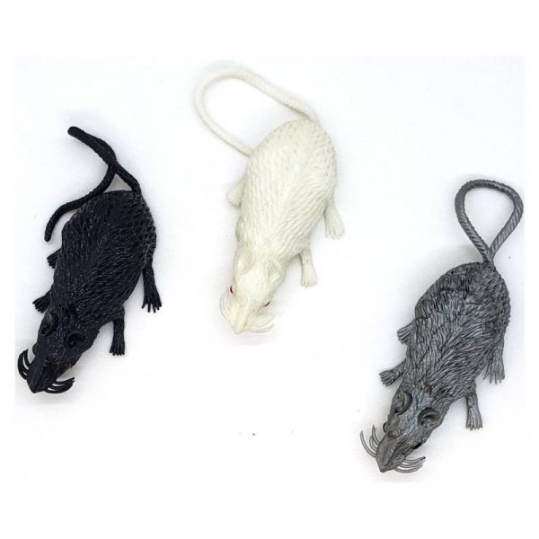 Some customers like to buy a cute little 3″ Gray Rubber Mouse for their cats to play with! The tail wiggles and cats love it! These can be used for Halloween decorations, plays, and productions. White and black mice have red eyes.