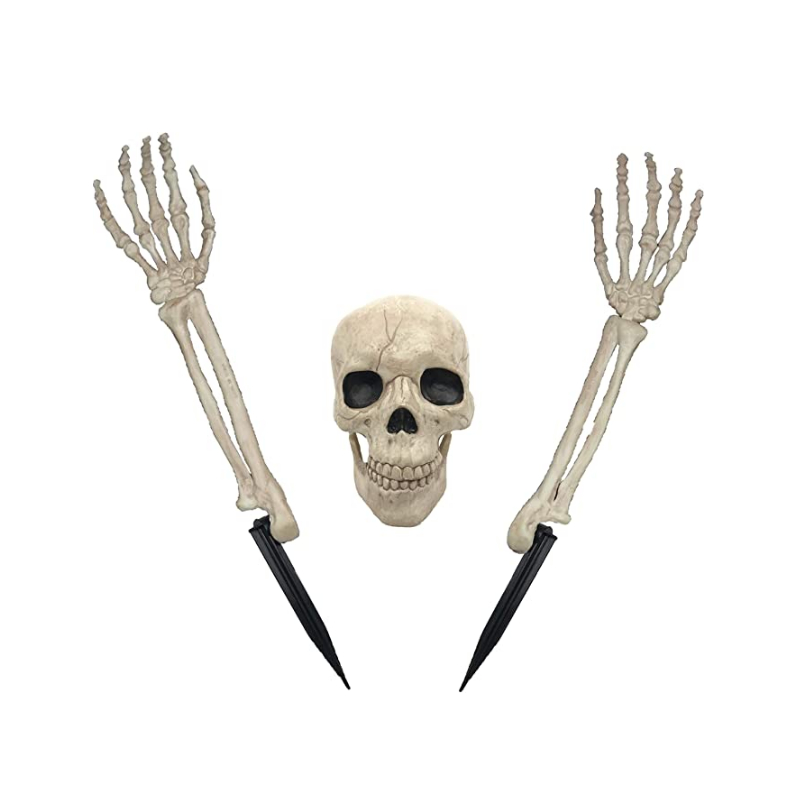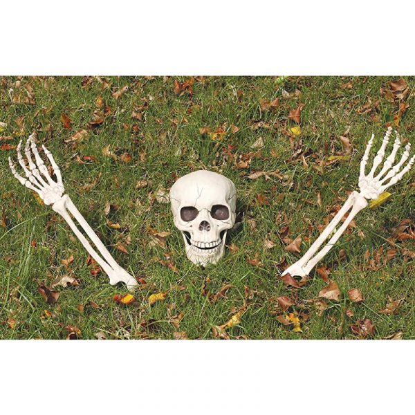 3 Piece Costume Plastic Buried No More Skeleton Set is a spooky yard decoration. It includes 2 arms with hands that have stakes to secure them to the ground. The skull has a stake behind the upper teeth. It has a moveable jaw so you can place rat skeletons, pirate coins, or anything else!
