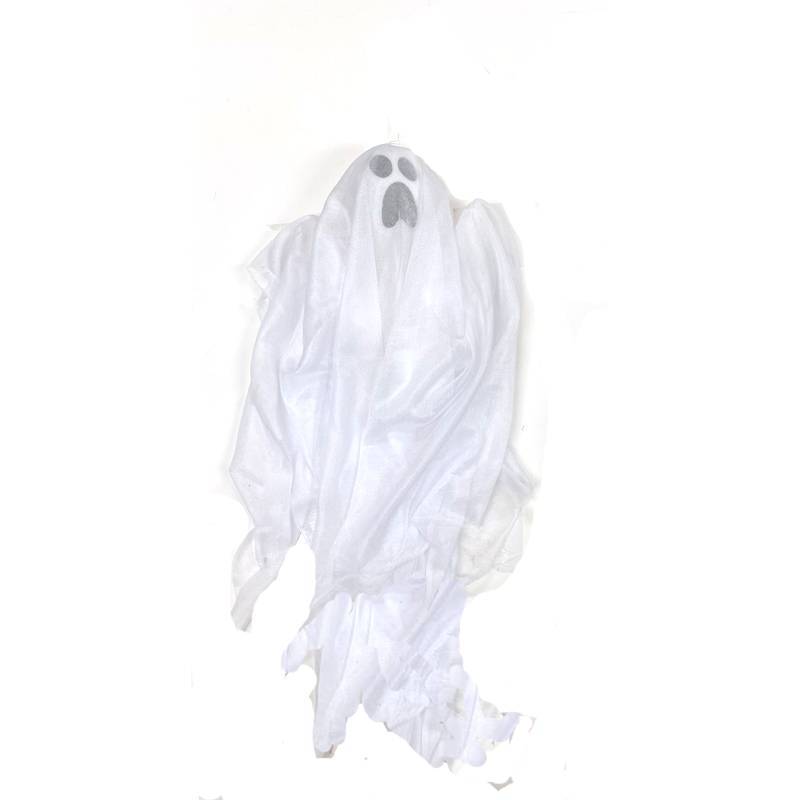 This White Fabric Hanging Ghost hangs 18″ or 32″ from the tip of his head to the longest cut of fabric.