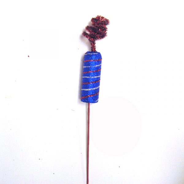 5″ Glitter Firecracker Pick. Assorted Colors of firecrackers, either red, white, or blue background features silver glitter. Each one is on a stick. Perfect for adding to a floral arrangement, wreath, or patriotic centerpiece.