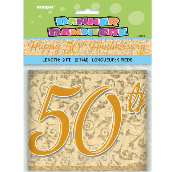 50th Anniversary Prismatic Vinyl Banner is bright and sparkly gold. This banner is 9′ long x 5″ wide. Use this to help celebrate a momentous occasion.