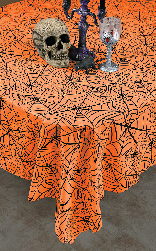 Be the Host with the Most with this spooky web design table cover! Features a black web pattern on an orange or white background.