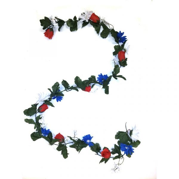 6′ Gerber/Rose Bud Garland features red Rose buds, white Gerber daisies, blue Gerber Daisies and small white accent flowers on a leafy green garland.