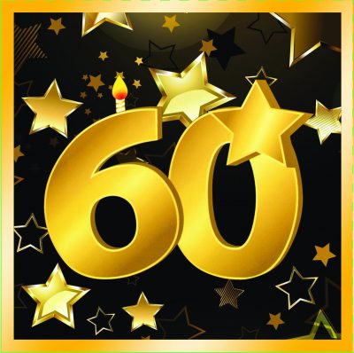 60 and Sensational Satin Birthday Button measures 2″ big. This is a white satin button with a big red “60” in the middle. “& SENSATIONAL” is written below in red and blue. Stars, dots, and swirlys decorate all around.