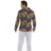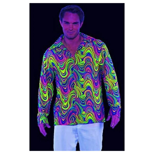 - Color and Fabric: The shirt is in bright, neon colors and bold patterns designed to glow under blacklight. Fabrics such as synthetic fibers or high-contrast materials are common, as they react vividly to UV light.