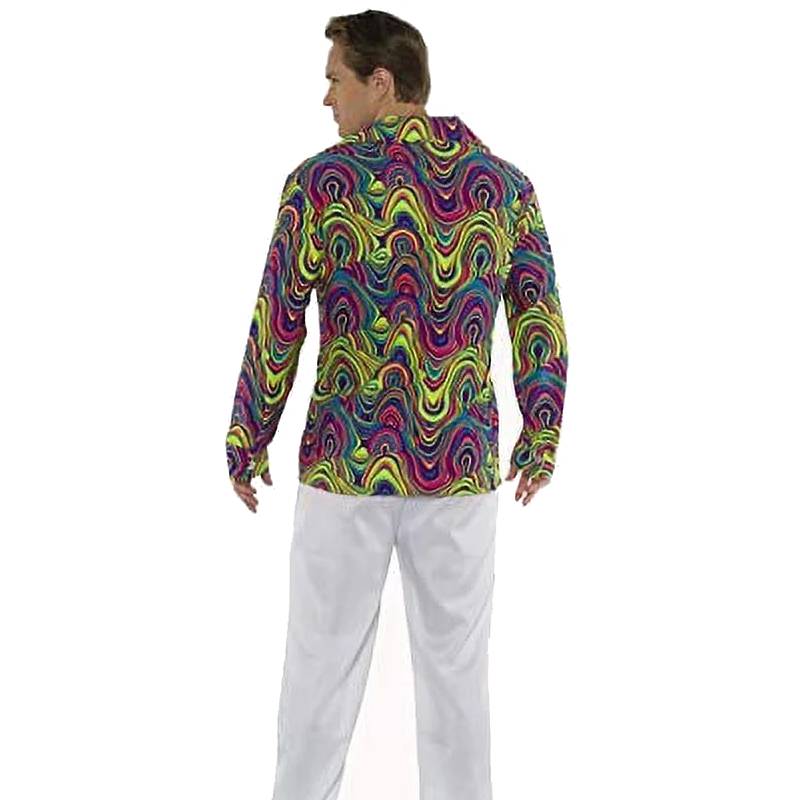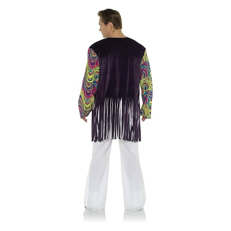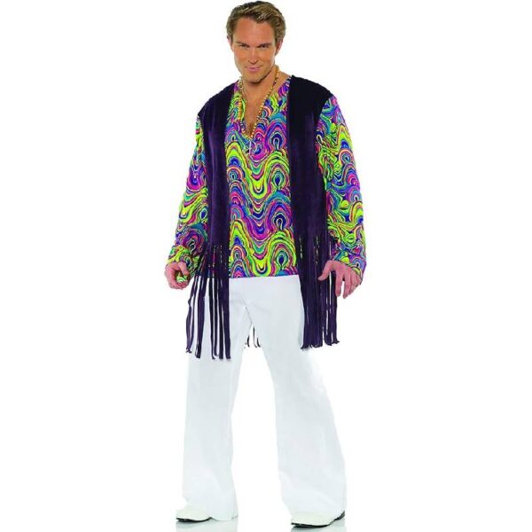 The combination of the blacklight shirt and fringed vest creates a visually striking and eclectic look. The 60s Blacklight Shirt w Fringed Vest shirt’s vibrant, glowing patterns contrast sharply with the textured, flowing fringe of the vest. This outfit is emblematic of the psychedelic and bohemian fashion trends of the 1960s, often seen in music festivals, dance clubs, and other lively social settings. Wear this for Halloween, themed parties, and more.