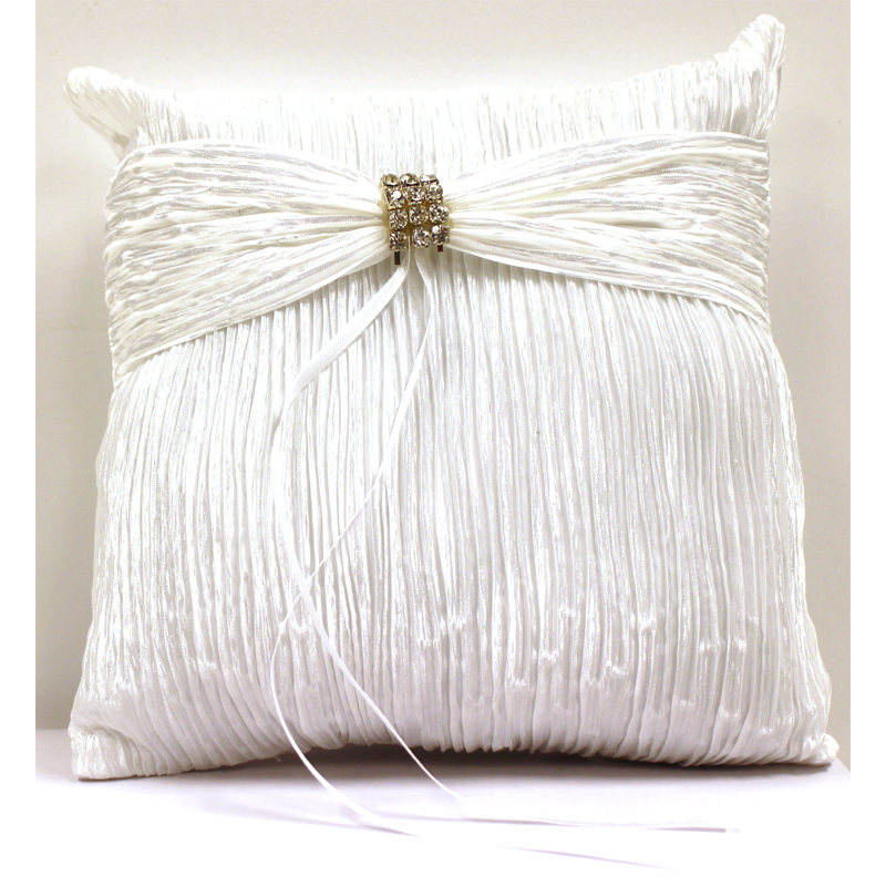 Your Ring Bearer can carry this lovely square pleated fabric pillow down the aisle in white or ivory! This 7″ pillow features a rhinestone band accent.