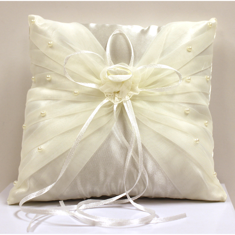 Your Ring Bearer can carry this lovely square satin and tulle pillow down the aisle in white or ivory! This 7″ pillow features a pearls accent.