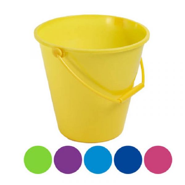 Small 7″ bucket container with sturdy handle for carrying. Features a lightweight plastic and 6 different color variations.