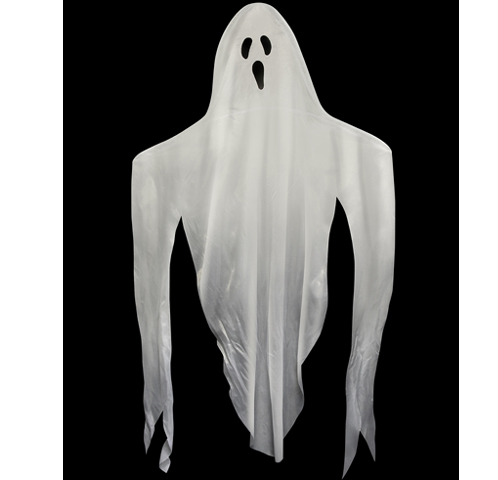 32″ hanging ghost. Use it as a prop or Halloween decoration. You can hang it inside or outside in good weather. It has poseable arms so you can bend them to point in any direction.
