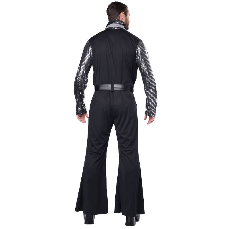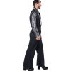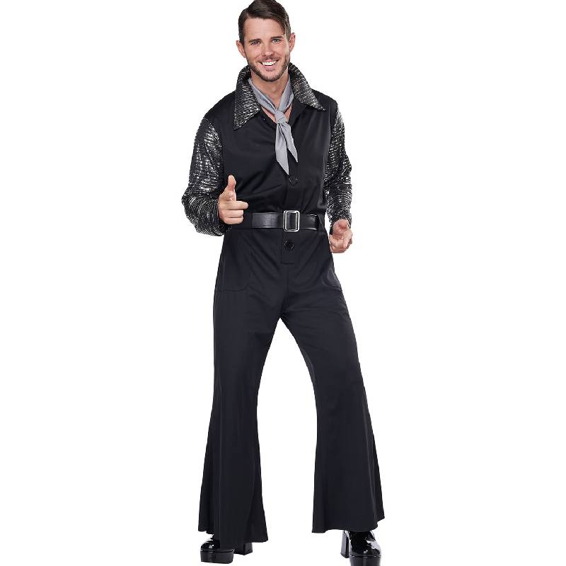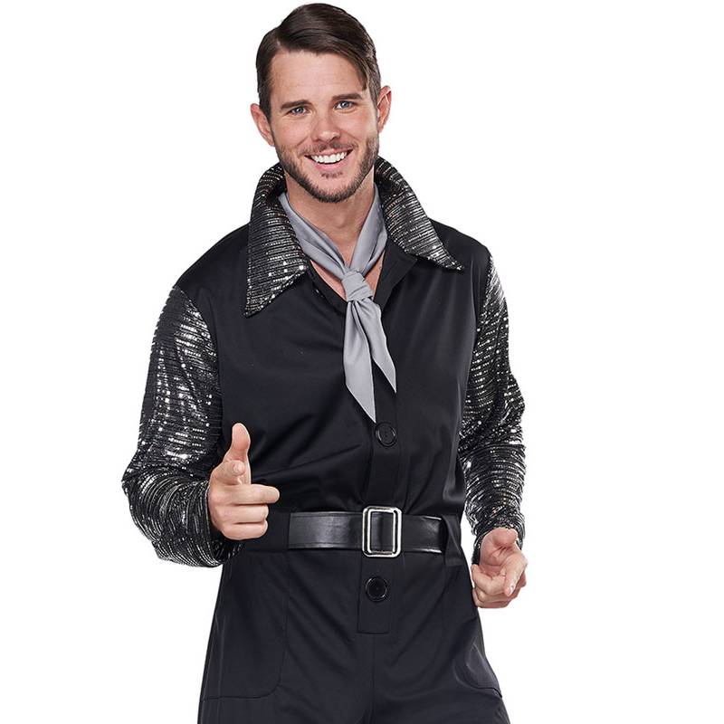 70s Flashy Men’s Jumpsuit buttons down. It has attached metallic fabric sleeves and collar. It comes with a detachable belt with a decorative buckle. The gray neck scarf is adjustable to fit all neck sizes.