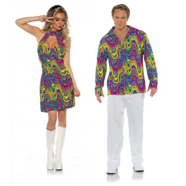This 70s Halter Top Glow Dress goes perfectly with 70s Blacklight Shirt. Wear this to a 70s themed party! Dress includes a wide fabric hair tie.