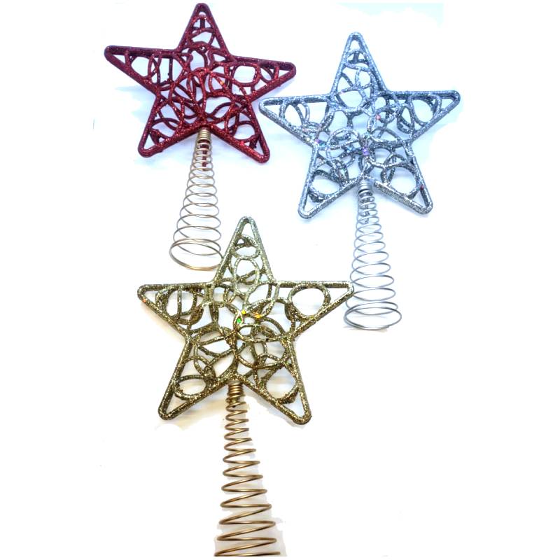 8″ 3-D Glittered Star Tree Top Asst Colors for the Christmas season. Choose from red, gold, or silver. Decorate for a large event and buy all three colors!