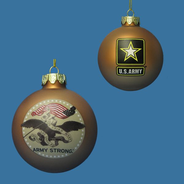 Round U.S. Army Glass Ornament is gold with the Army Strong tagline and logo on the front. It also has the U.S. Army Star on the back. This is a hand-crafted ornament. It is an official licensed product of the U.S. Army. It is about 3″ in diameter.