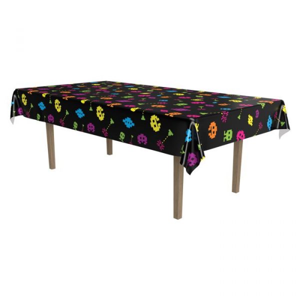 Brightly colored 8-bit arcade invaders from space on a black background. Since this product is plastic, it makes for an easy clean up.