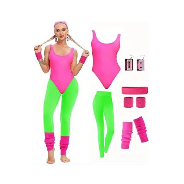 This 80’s Lady’s Workout Costume is a perfect choice for Halloween or any 80s themed event! It includes a leotard, tights, leg warmers, headband, wristbands and earrings. One size fits most!