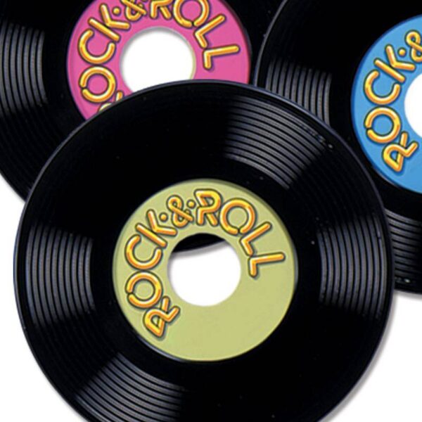 If you’re having a musical theme for your party, or maybe a Rock and Roll theme, you may like these records. Each one measures 9 inches across. Each package includes 3 records. The labels feature different colors and sayings.