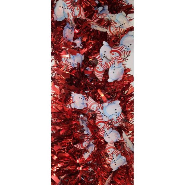 9′ Vinyl Holiday Tinsel Garland w Snowmen adds color and shimmer to your party decorations. Use this for holiday parties. Wrap the garland around a banister. Hang this on a wall or dress up the party table.