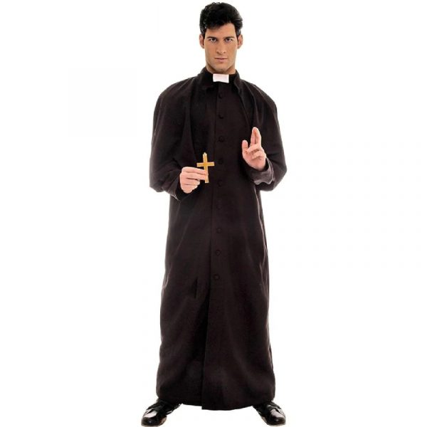 Deluxe Priest Adult Costume. Get everyone’s attention this Halloween in a saintly disguise! This Priest Costume features a floor length long sleeved black robe with an attached collar having a white strip at the center. It comes with a detachable caplet. The robe buttons down the front. Bless everyone when you dress up in this saintly costume! This comes in 2 sizes: Adult Standard and Adult XXL. Wear this for Halloween, theatrical productions, reenactments, cosplay, school plays, themed parties and more.