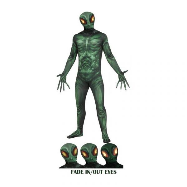 Alien Cosmic Fading Eyes Costume is creepy and easy to wear. This is a one piece screen print jumpsuit with zipper back. It has stuffed long fingers, detachable hood, and fade in/out mechanism glasses! Wear this for Halloween, themed parties throughout the year, theatrical performances, costume parties and contests, and more.
