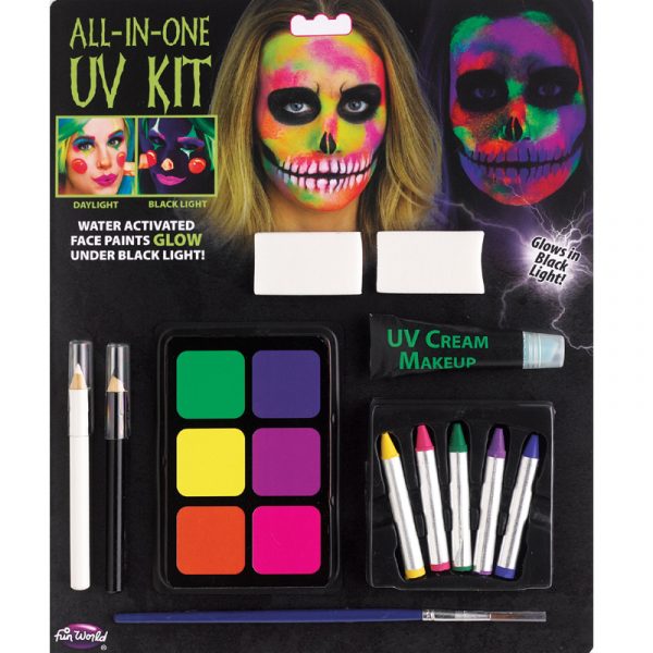 All-in-one UV Makeup Kit. Water activated face paints GLOWS UNDER BLACK LIGHT! Remove with soap and water.