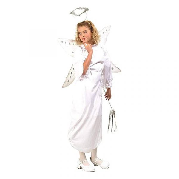 Child’s angel costume includes dress, waist tie cord, and tinsel halo. Wings sold separately. Perfect for a school project, book report, Christmas play, or Halloween costume.