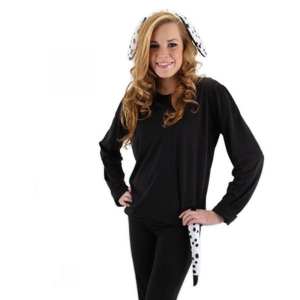 Animal Ears and Tail Set – Dalmatian. Faux fur ears are attached to a headband for ease of wear. Faux fur tail has a loop on the end so you can thread a belt through it and wear it that way or you can just pin it in place.