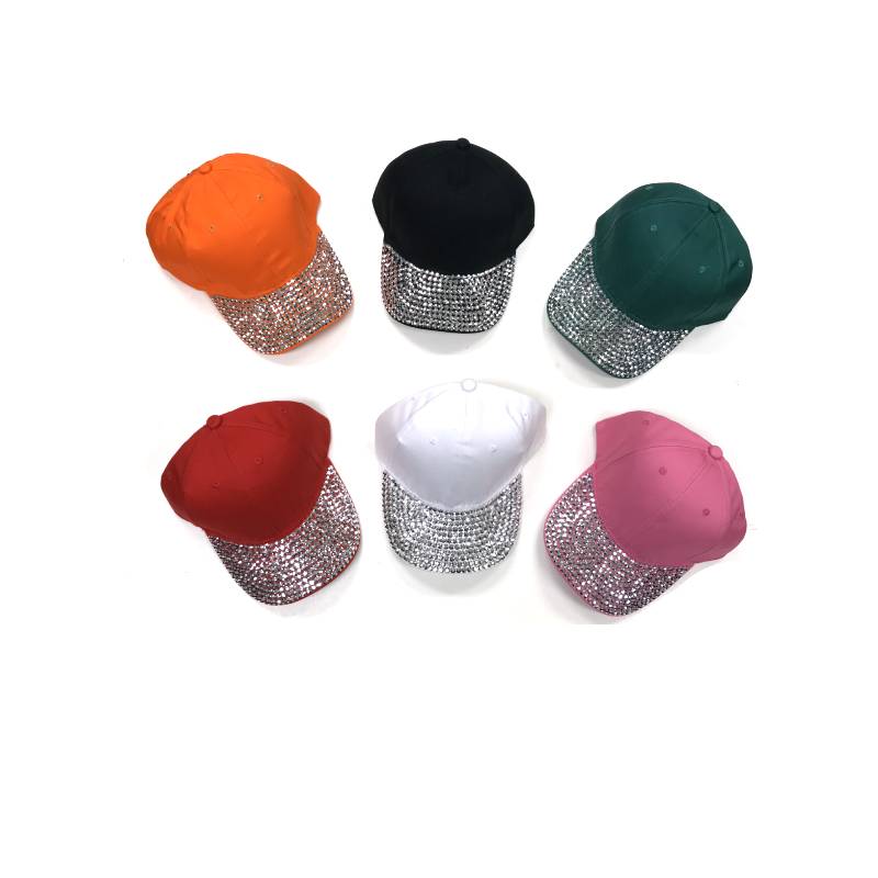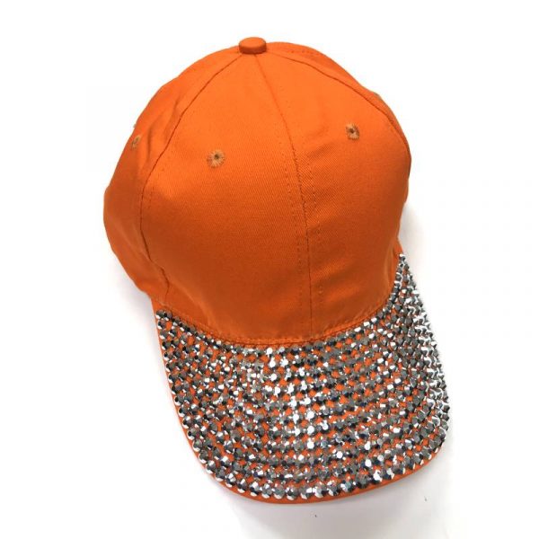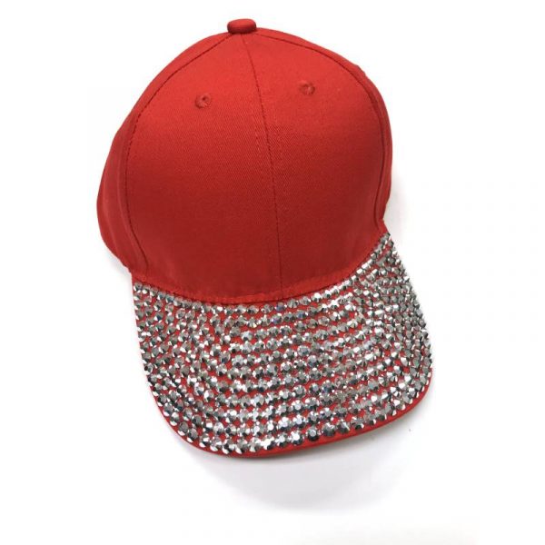 This Fourth of July, wear a Deluxe Rhinestone Brim, Adjustable Ball Cap. Choose a red, white, pink, green, orange, or black ball cap for 4th of July. Each cap features a wide brim with rhinestones covering the top. Each cap includes a small package of spare rhinestones.