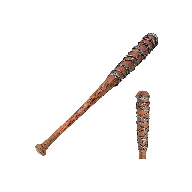 This barbed wire bat, as seen on Walking Dead, is a costume prop that captures the gritty and menacing essence of a weapon often associated with post-apocalyptic, horror, or survival-themed characters. The bat is designed to resemble a baseball bat typically seen in sports, but with the addition of faux barbed wire wrapped around its length. This gives it a rugged, dangerous appearance suitable for characters who are tough and resourceful in challenging environments. The bat itself is made from lightweight plastic to ensure it is safe for costume use. Despite its appearance, the bat does not have real barbed wire, ensuring it poses no harm during handling. The barbed wire is carefully crafted to look realistic, featuring twists and knots that simulate the menacing appearance of real barbed wire.